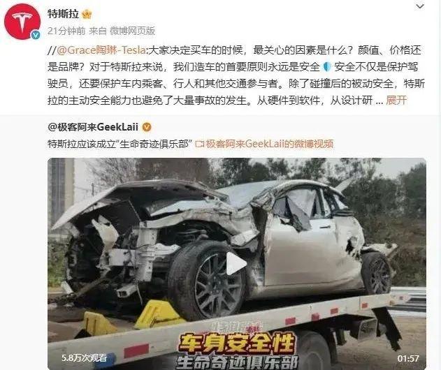 电动知家获悉,近日,特斯拉官微转发全球副总裁陶琳微博发文,陶琳强调特斯拉在汽车设计和制造过程中始终将安全放在首位,致力于打造最安全的智能汽车。她表示,安全不仅是保护驾驶员和乘客,还包括行人和其他交通参与者。除了碰撞后的被动安全,特斯拉的主动安全能力也避免了大量事故的发生。陶琳表示,特斯拉追求安全极致,从硬件到软件,从设计研发到生产制造,都只和物理学极限做比较。特斯拉的理念是,愿所有人都能安全驾驶,平安回家。