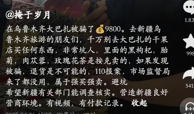 然而,新疆大巴扎的一家干果店却给了我们深刻的一课。一位去新疆旅游的游客,随便买了一些干果就花了9800元,而且店家态度强硬,坚持不让退换。
