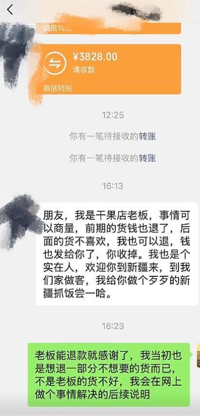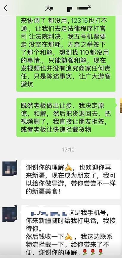 同时,她还晒出了聊天记录,从中可以看出大巴扎商家的态度比较诚恳,表示货和钱都可以退。游客也表示理解,最终选择与商家和解。