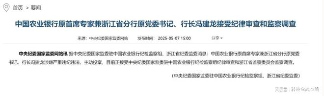 浙江金融圈沦为腐败重灾区5月7日,中央纪委国家监委网站发布消息,农业银行浙江省分行原党委书记、行长冯建龙涉嫌严重违纪违法,主动投案,目前正接受纪律审查和监察调查。冯建龙是一位老农行人,早年曾任农行湖南、浙江两地分行副行长,2012年冯建龙从农行重庆分行行长调任浙江分行行长,这一干就是5年。这之后,冯建龙卸任农行浙江分行行长,出任浙江省银行业协会会长。意外的是,在干了几年会长之后,冯建龙突然咸鱼翻身,再度出任农行浙江分行行长,这一干又是4年。直到2017年9月,出任农行首席专家。冯建龙是农行近年来查办的一大要案。据媒体报道,从冯建龙家中搜出巨额现金及购物卡、奢侈品。其两任配偶、孩子及多名民企老板也被一起带走留置。此外,冯建龙还被指私生活混乱,在浙江、重庆分行情妇众多,婚外生子,与第二任配偶年龄差距几十岁。冯建龙仅仅是浙江金融圈贪腐案的冰山一角。