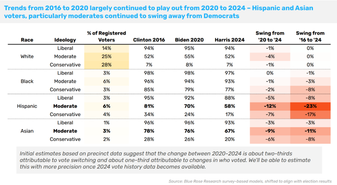 上面的图表按种族和意识形态列了2016、2020和2024年候选人的支持率,展示了一个明显趋势。