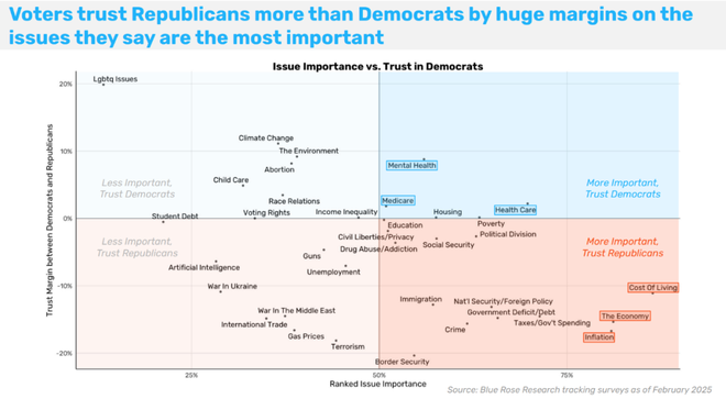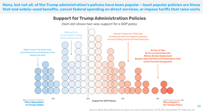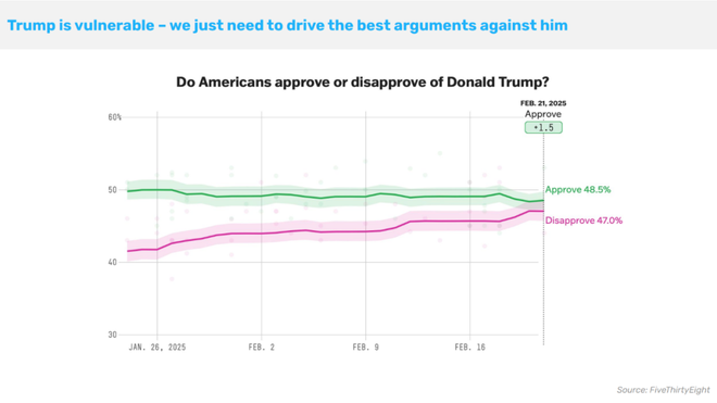 这些数据表明,接下来几个月中,应该做两件事:一是反对削减社会福利,二是抨击马斯克制造混乱。这两点,既符合的理念,也是选民非常关心的问题。