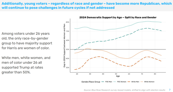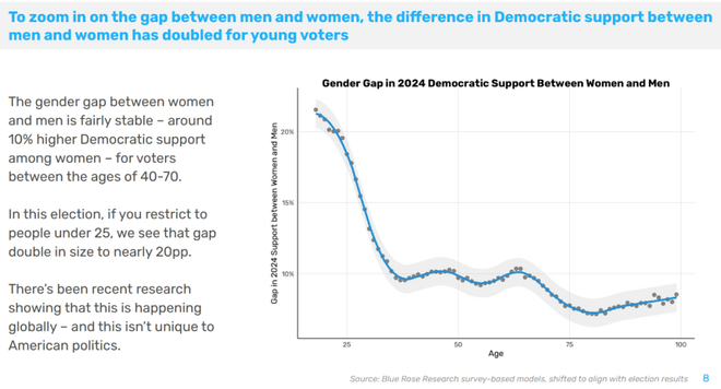 年轻男性和年轻女性投票差别有史以来最大 令人震惊的年轻人右转 失去了移民温和派选票 选民想要对制度进行重大改革 最有效的竞选信息是经济平民主义 川普其实很脆弱 ——Blue Rose Research