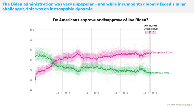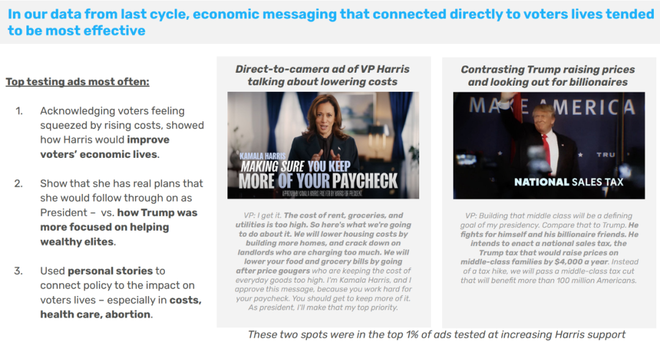 这些都是最好的竞选广告。也证实了选民最关心的是生活成本,而且选民对现状不满。哈里斯能在广告中承认:事情的确很糟糕,正是那条广告测试效果好的一个原因。