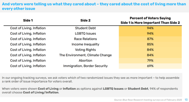但肖尔认为哈里斯可以做得更好,赢得那场选举是有可能的。Blue Rose Research向被调查者展示国家面临的两个问题,问哪一个更重要。只要把生活成本或通胀与其他问题放在一起,十个人中就有八到九个认为生活成本和通胀更重要。这恰恰说明选民对拜登处理通胀、预算赤字问题上的做法非常不满。