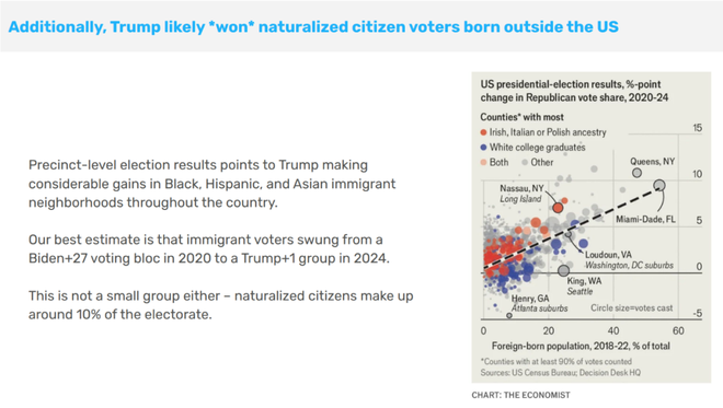 归化公民约占选民总数的10%,这意味着移民支持川普的增长率,比整体选民增长率的中位数要大得多。肖尔猜测他们有23%背弃了。那么,川普获得的净胜选票有一半来自移民。川普在纽约、加州、德州和佛罗里达这四个移民集中的大州表现非常好。战场州可能向川普倾斜了半个到一个百分点,那就足以让他获胜。