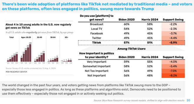 过去四年中,从TikTok获取新闻的年轻选民人数增长了四倍多,这是媒体消费领域最大、也是最快的变化,而且与支持率下降密切相关。TikTok的用户更年轻,政治参与度也更低,在这一群体的支持率下降,是意料之中的。那些从TikTok上获取新闻的群体,支持共和党的比例比四年前高了8%,增长幅度相当大,而这正是选举前川普承诺救下TikTok的原因。