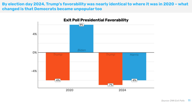 这张图表是根据2020年和2024年和共和党总统候选人支持率的出口民调,显示川普在去年大选和2020年一样不受欢迎,甚至稍微更不受欢迎。但变了的是,拜登的净支持率曾为正6%,而哈里斯的净支持率为负6%。但肖尔认为不是不应换下拜登。相反,下图显示,正是拜登支持率太低,连累了哈里斯。