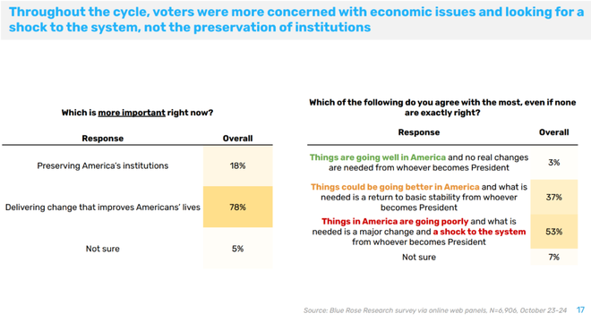 对于“目前最重要的,是维护制度,还是改革”这个问题,78%的选民回答“改革”。问到现状,是“可以更好,需要改进,以回到从前”还是“太糟了,需要对系统进行冲击”,大多选择后者,比例是53%,选前者的是37%。这显示选民希望发生大的变革。副总统哈里斯被视为现有系统的一部分,这是她败选的原因之一。