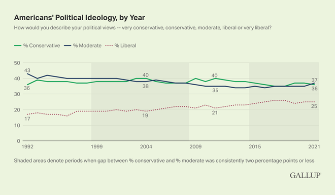 美国约有37%的人认同保守派,36%温和派,自由派有25%(根据问题不同,分布也可为40%、40%、20%)。