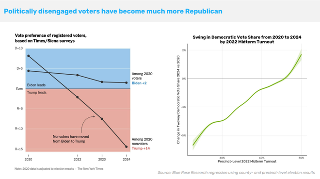 但不能都归因于通胀。政治上不活跃的选民在奥巴马时代坚定地支持,支持率高出10-15%,在2020年大致两边均衡,但在2024年,支持共和党的比例上升了14%。