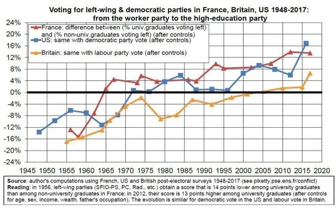 下图是肖尔早在2021年对英、法美、三国的选举分析:每条线代表一个国家左翼政党在教育程度低人群和教育程度高人群中的支持率差异,三条线都随着年代推移上升,说明三个国家基于教育程度的差别都越来越大。[注]