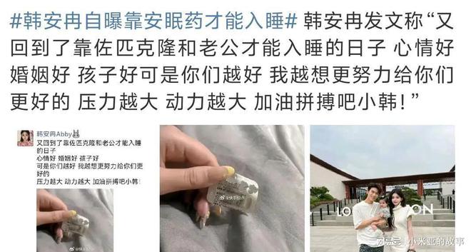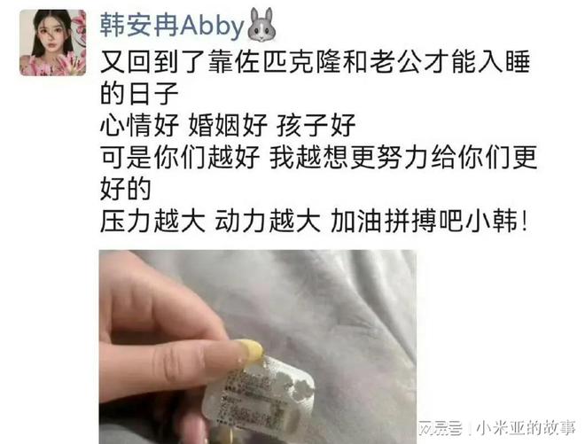 韩安冉自己发文称“又回到了靠佐匹克隆和老公才能入睡的日子 心情好 婚姻好 孩子好可是你们越好 我越想更努力给你们更好的 压力越大 动力越大 加油拼搏吧小韩!”